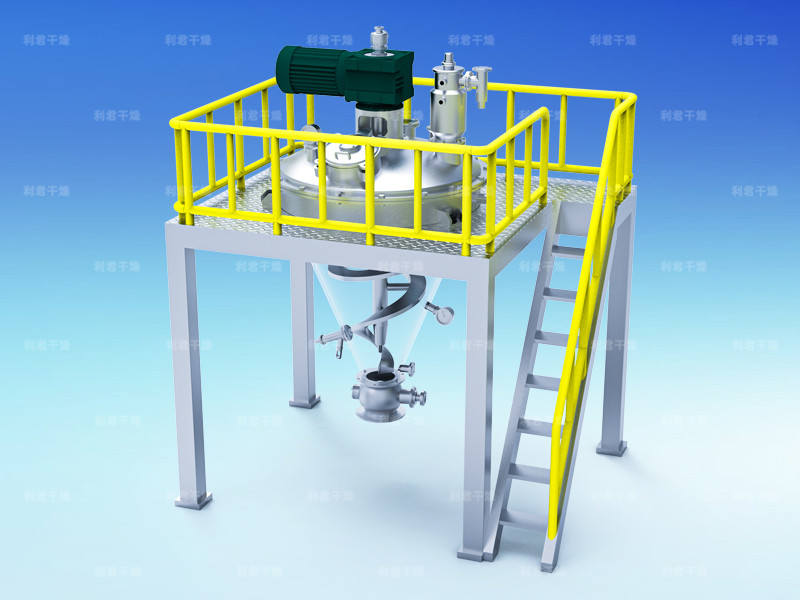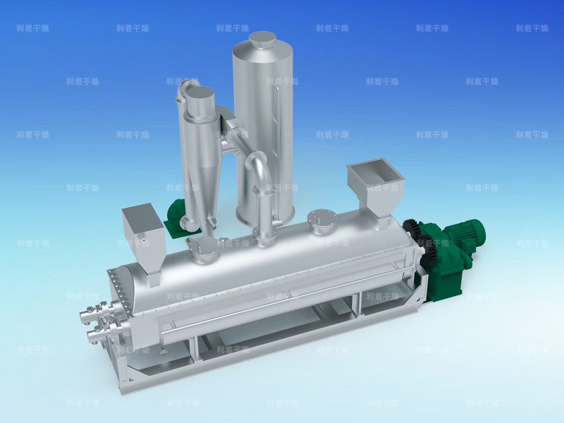熱空氣切線進(jìn)入干燥器底部,在攪拌器帶動下形成強有力的旋轉(zhuǎn)風(fēng)場。膏狀物料由螺旋加料器進(jìn)入干燥器內(nèi),在高速旋轉(zhuǎn)攪拌槳的強烈作用下,物料受撞擊、磨擦及剪切力的作用下得到分散,塊狀物料迅速粉碎,與熱空氣充分接觸、受熱、干燥。脫水后的干物料隨熱氣流上升,分級環(huán)將大顆粒截留,小顆粒從環(huán)中心排出干燥器外,由旋風(fēng)分離器和除塵器回收,未干透或大塊物料受離心力作用甩向器壁,重新落到底部被粉碎干燥。