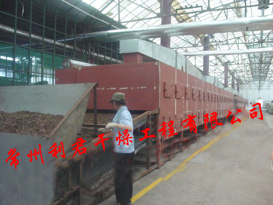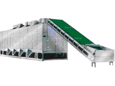 物料由加料器均勻地鋪在網(wǎng)帶上,網(wǎng)帶一般采用12-60目不銹鋼絲網(wǎng),由傳動裝置拖動在干燥機內(nèi)移動。干燥機由若干單元組成,每一單元熱風獨立循環(huán),部分尾氣由專門排濕風機排出,廢氣由調(diào)節(jié)閥控制,熱氣由下往上或由上往下穿過鋪滿物料的網(wǎng)帶完成熱量與質量傳遞的進程,帶走物料水份。網(wǎng)帶緩慢移動,運行速度可根據(jù)物料溫度自由調(diào)節(jié),干燥后的成品連續(xù)落入收料器中。上下循環(huán)單元根據(jù)用戶需要可靈活配備,單元數(shù)量亦可根據(jù)需要選取。